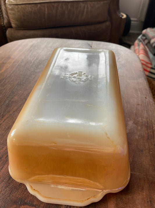 Anchor Hocking Fire King 9" Bread Loaf Pan peach iridescent dishes MCM 1950s