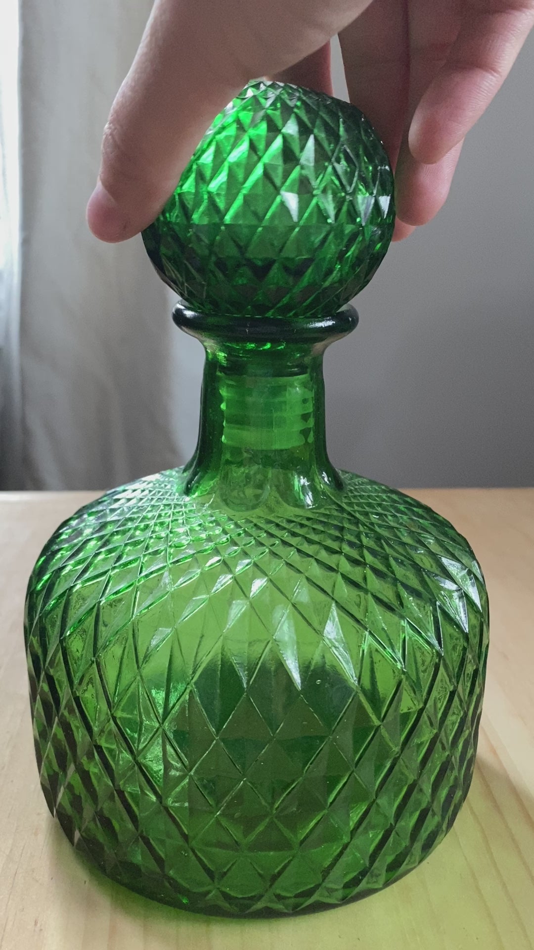 Vintage Hand-Blown Diamond Quilted Green Glass Empoli Decanter